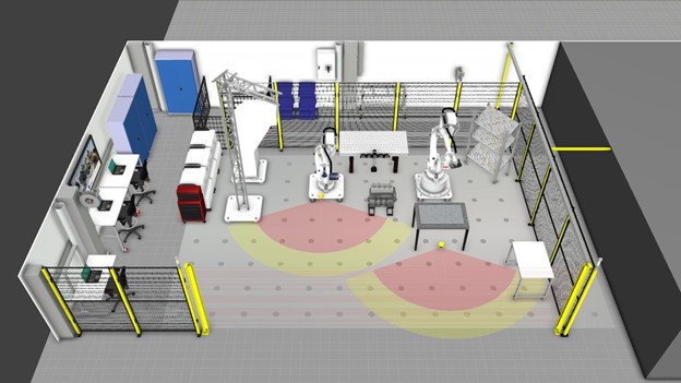 At Tampere University, a human-robot collaboration (HRC) pilot line is under development (see Fig. 1), which will be utilized in the ODIN project. The HRC pilot line consists of two heavy industrial robots (ABB IRB 4600), several industrial grippers (Schunk) and tools (Kolver screwdriver), different safety systems (SICK, Pilz) and tools for visual sensing and projection. Digital twin capabilities are supported by a Virtual Reality system (HTC Vive) and a virtual environment (see Fig. 2), for reconfiguration needs, cognitive assembly planning, production planning and safety aspects. The HRC pilot line aims to demonstrate how novel technologies can be integrated together. More details can be found here: https://research.tuni.fi/hrc-pilotline/